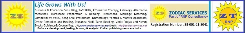 As the astro science, prasnam, remedies, mantras, vastu, numerology, tarot and other practises are coming under alternative belief system, it cannot replace any other real world/ related systems or medical care or traditional systems. The information provided within is intended to be used under professional instruction and guidance based on the interest of self and others. It is not a substitute book/ebook or guidance for any other related meditation or yoga practice. Please use common sense and walk the middle path as you develop your spiritual practice everyday. As there is no side effect or any other ethical or traditional or law system violation, still we are not responsible for the consequences of the exercises or programs in any way. The same applies to all the other material provided here, it is provided AS-IS with no warranties or guarantees. We or zodiac services, Chennai are not responsible for, and will not compensate in any way for, any loss or damage related directly or indirectly to the information on this book/ebook. Thanks for your cooperation!